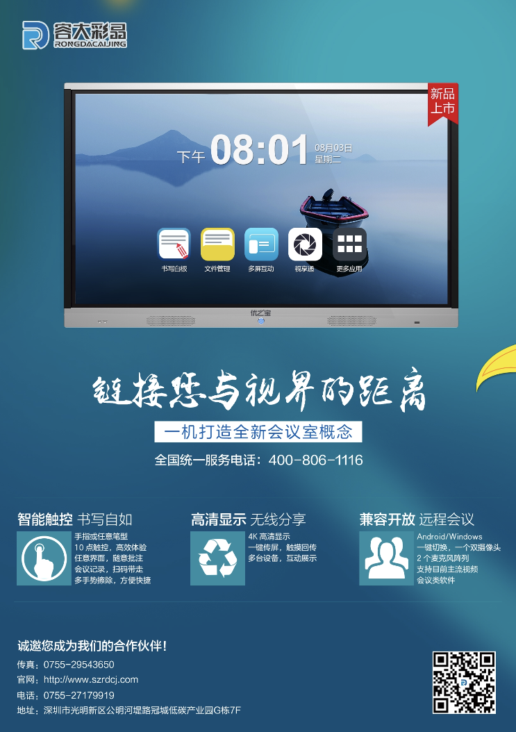 容大彩晶會議一體機將白板書寫、無線投屏、視頻會議、遠程協(xié)作、會議記錄、雙系統(tǒng),六大功能集于一體,移動方便、開機即用,全面滿足遠程會議等使用需求,帶給用戶極致體驗。